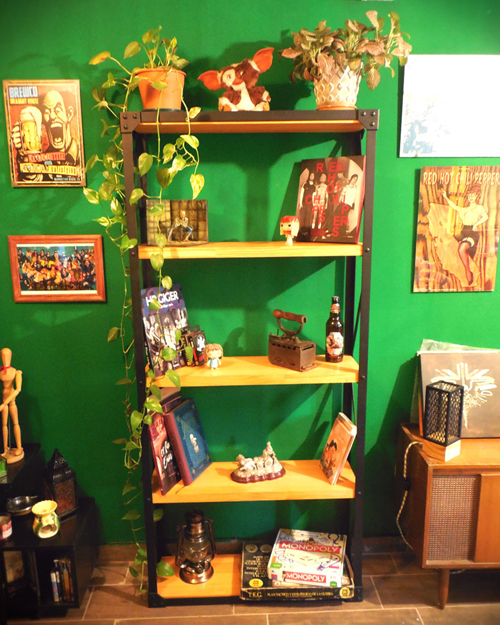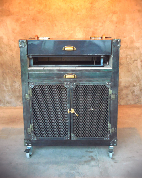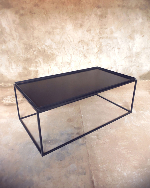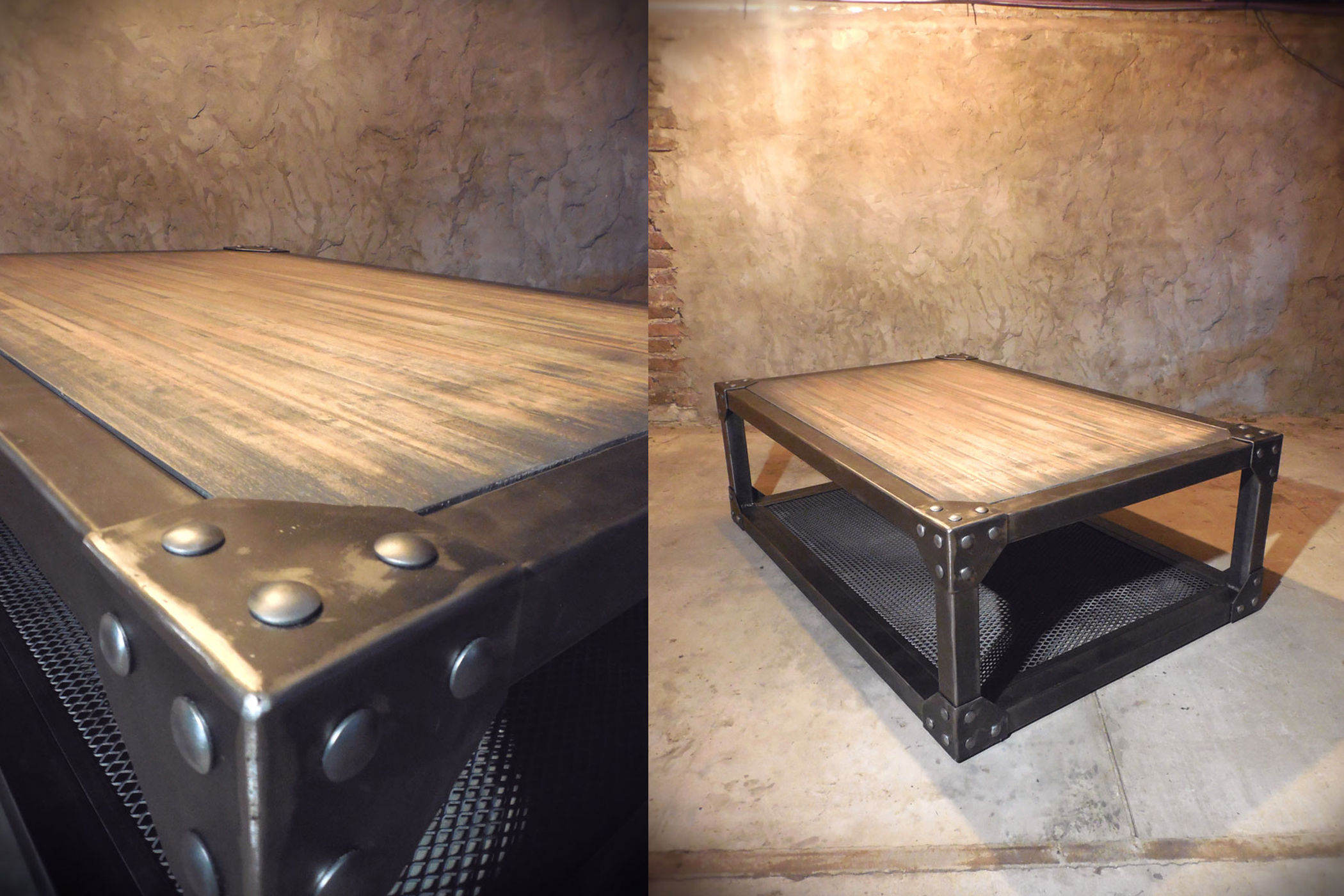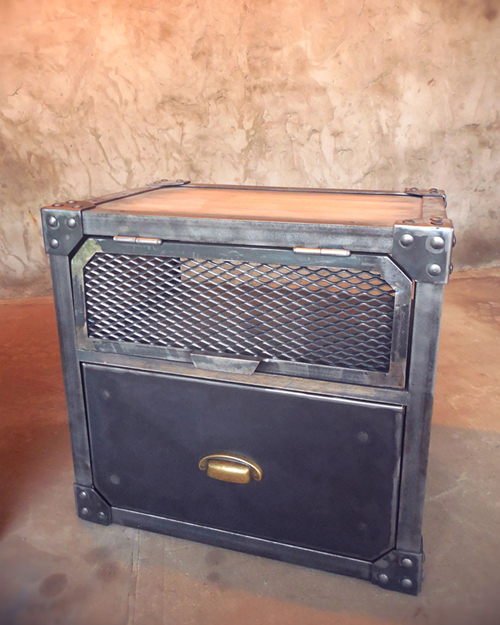 Trabajada en madera con patina oscura en combinación con hierro crudo todo en terminacion mate.