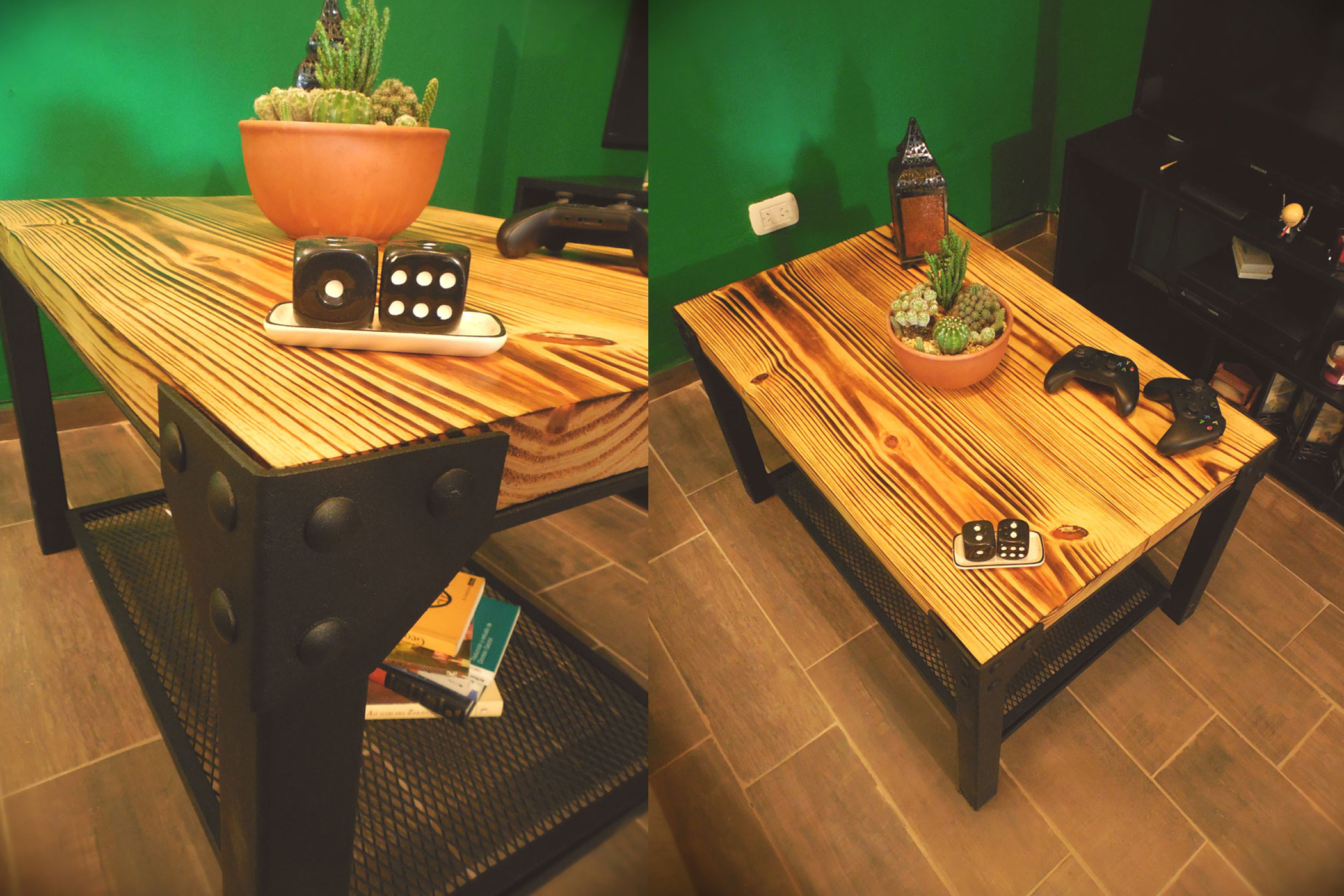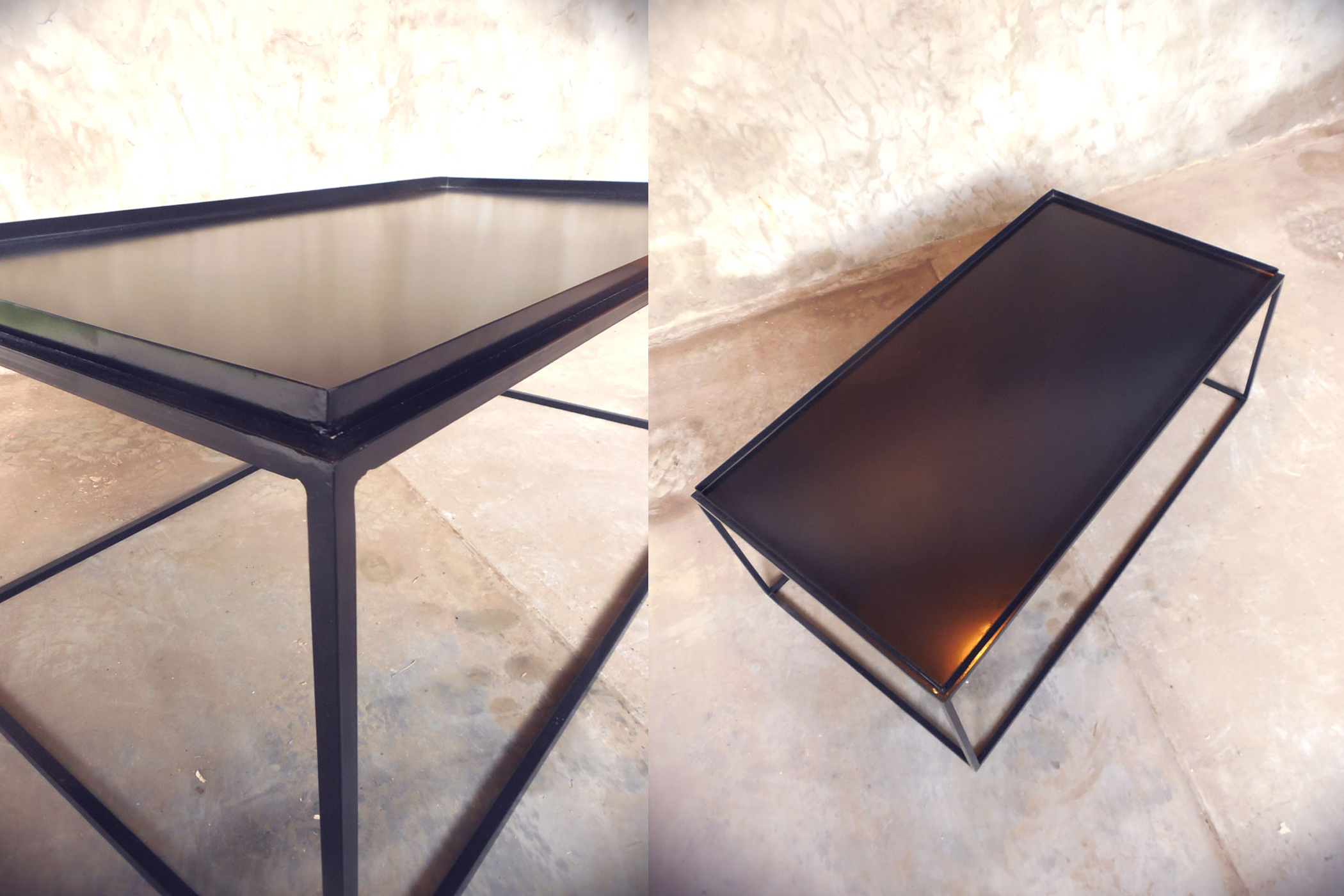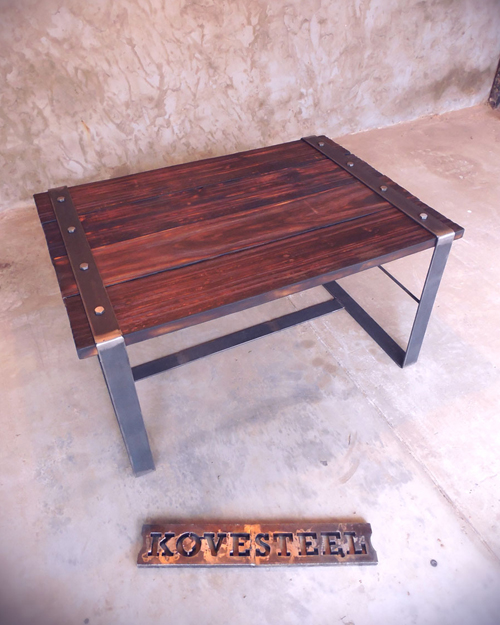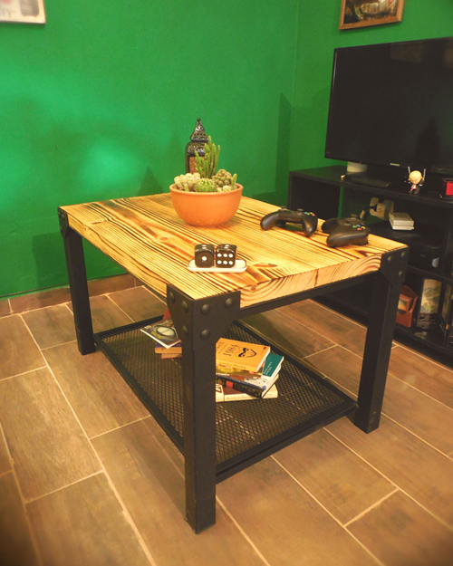 Mesa hierro crudo oscuro terminado con barniz mate y madera maciza de eucaliptus con terminacion en laca brillante.