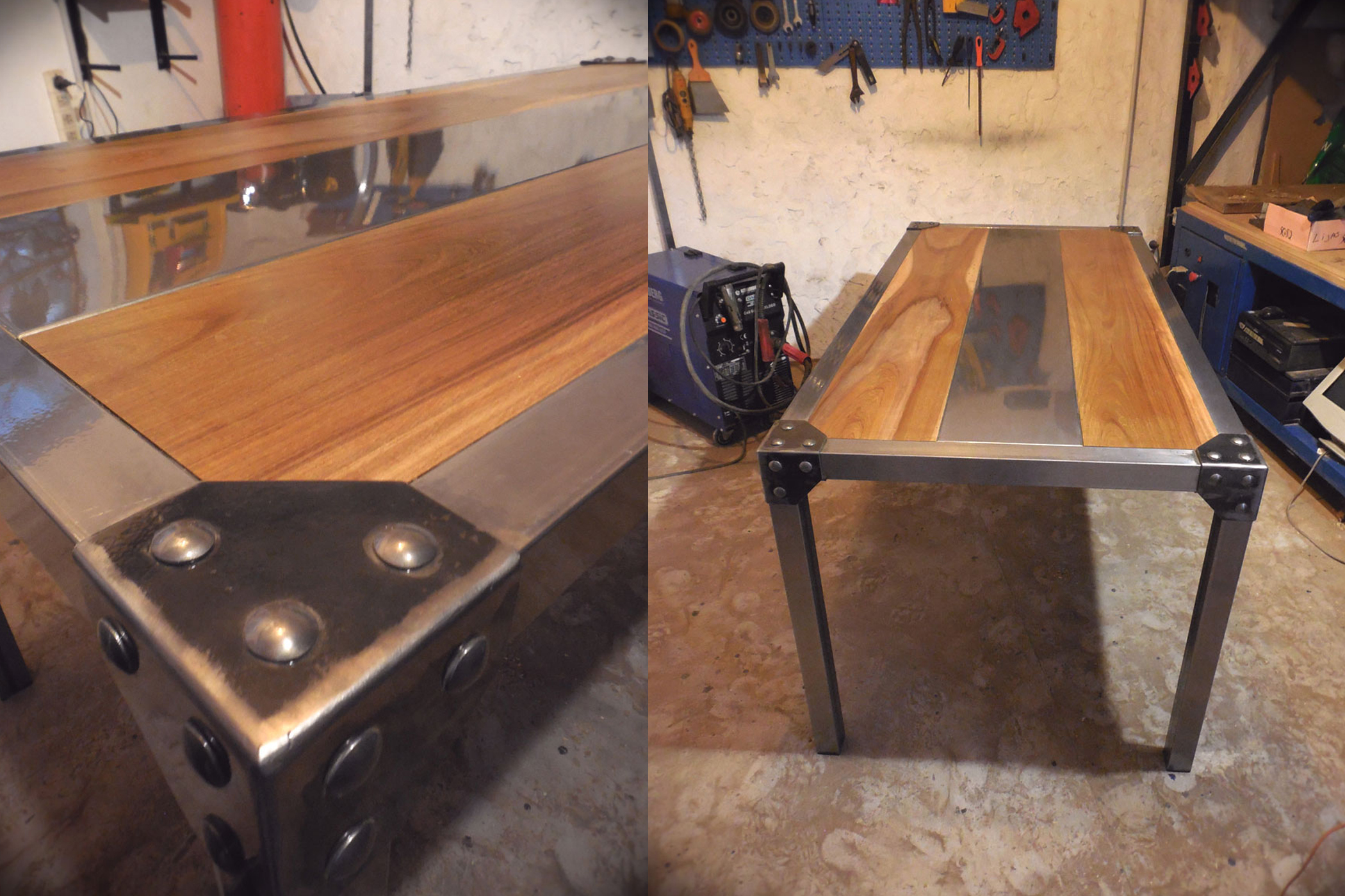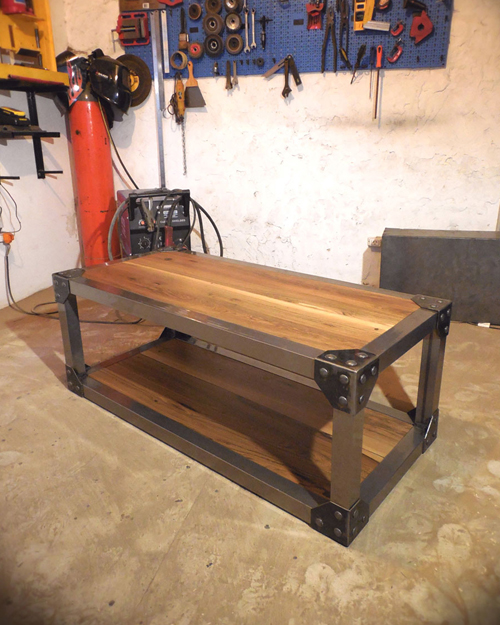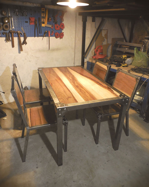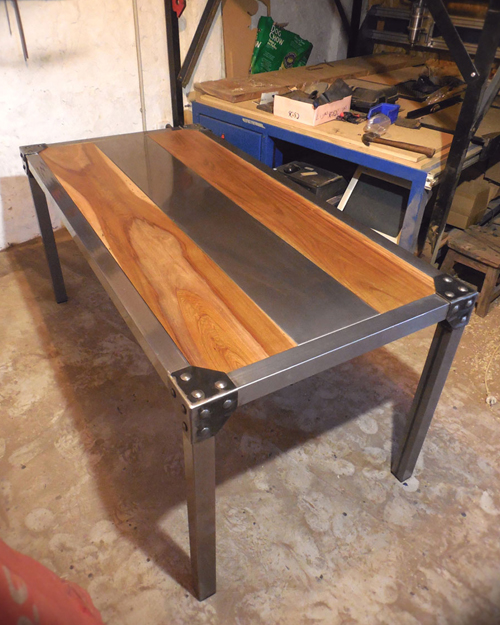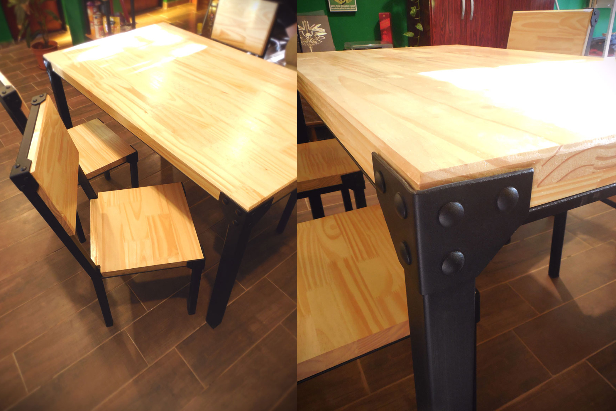 Mesa hierro crudo oscuro terminado con barniz mate y madera maciza de eucaliptus con terminacion en laca brillante.