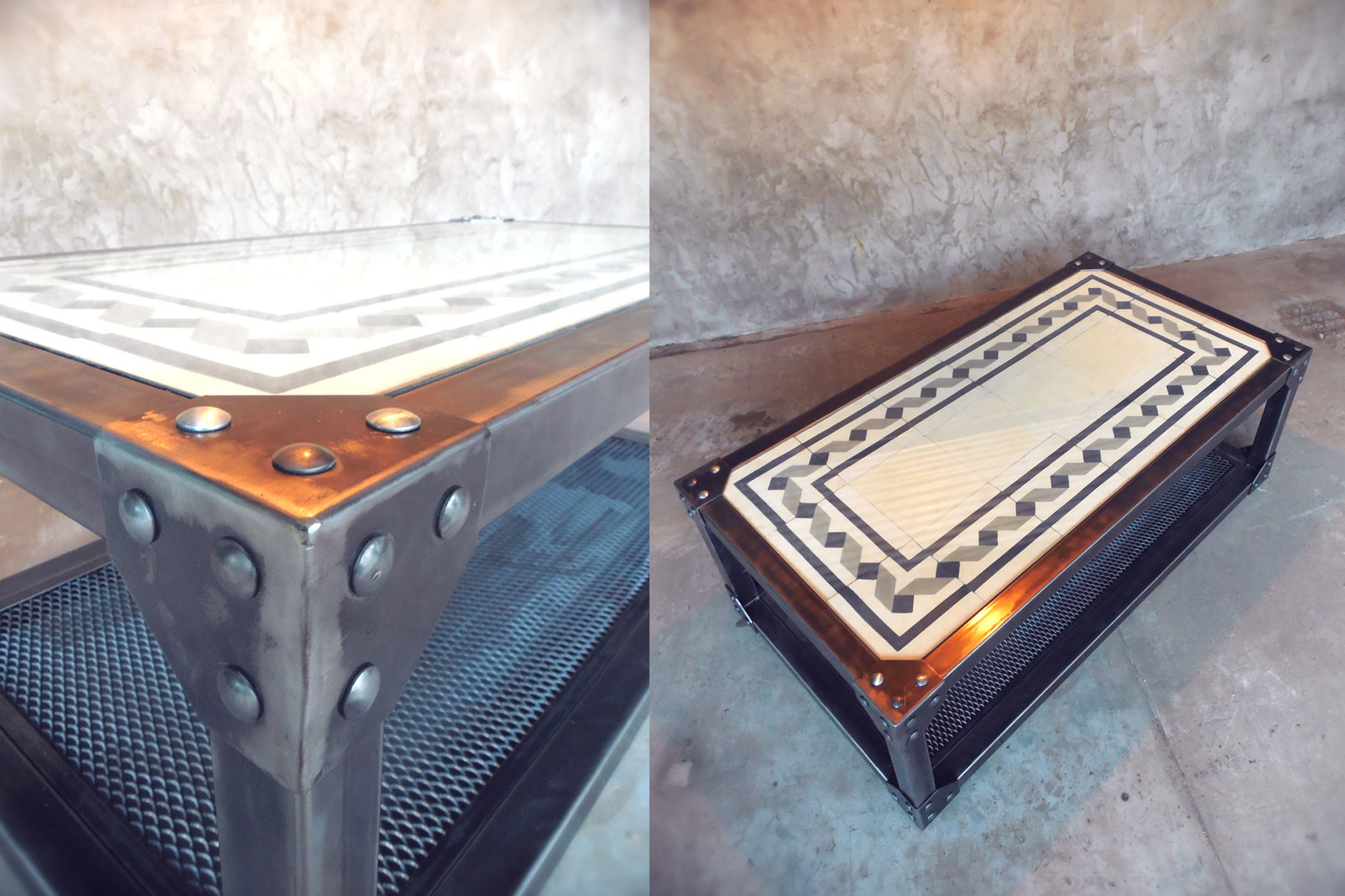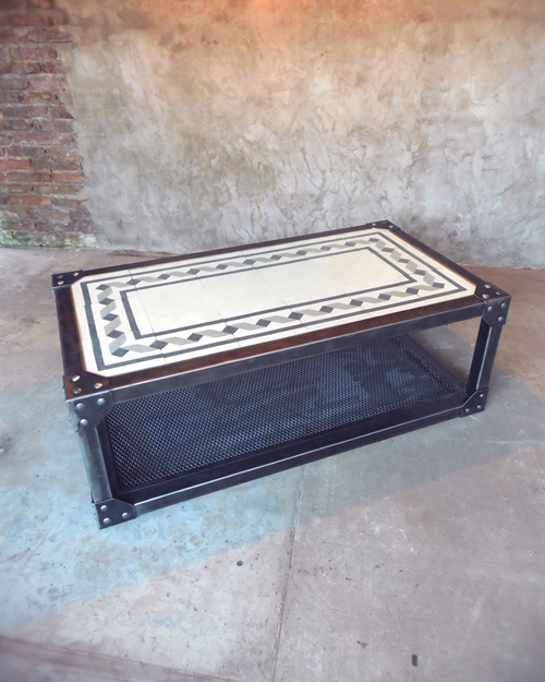Mesa ratona en hierro con terminacion mate o brillante, diseño interior en mosaicos ( el diseño queda a eleccion del cliente ) y vidrio protector.
