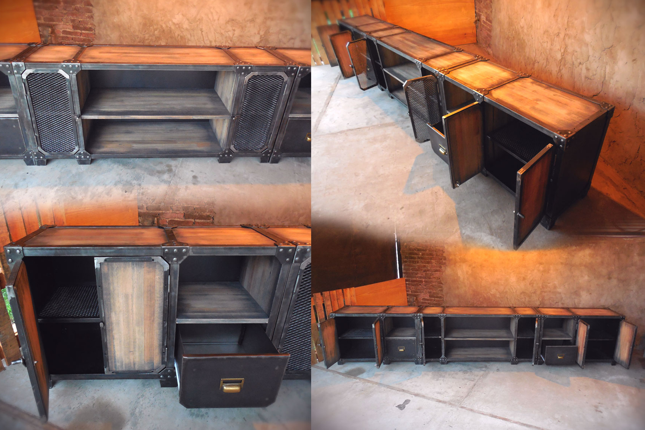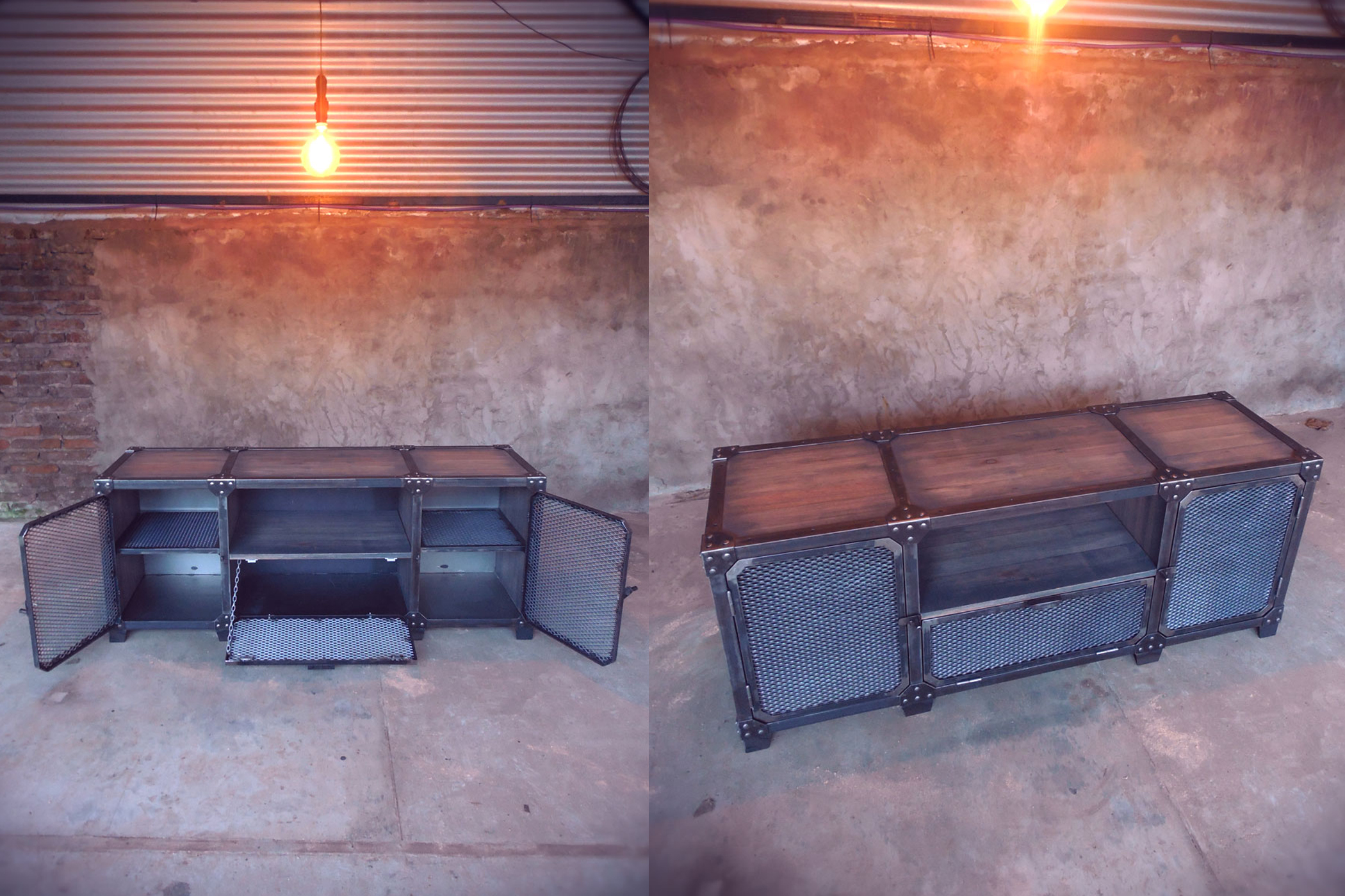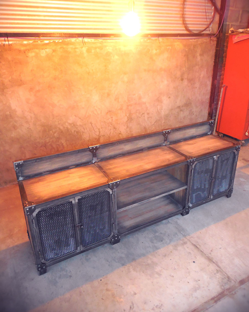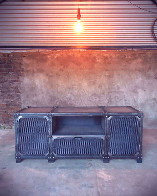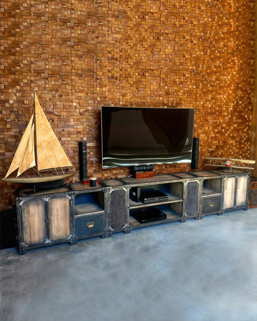 Modular TV en hierro crudo con barniz mate y madera maciza patinada terminada en laca mate.