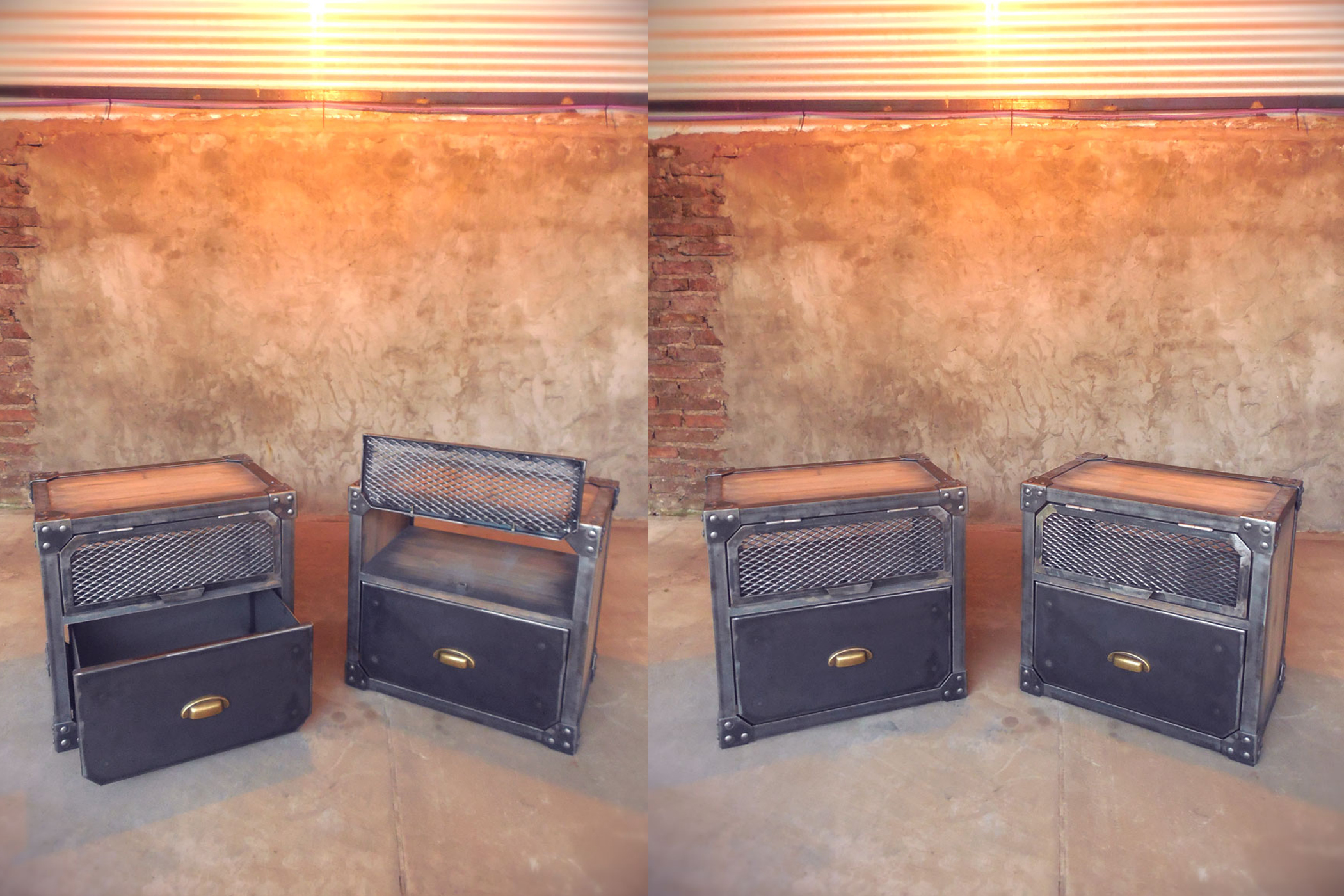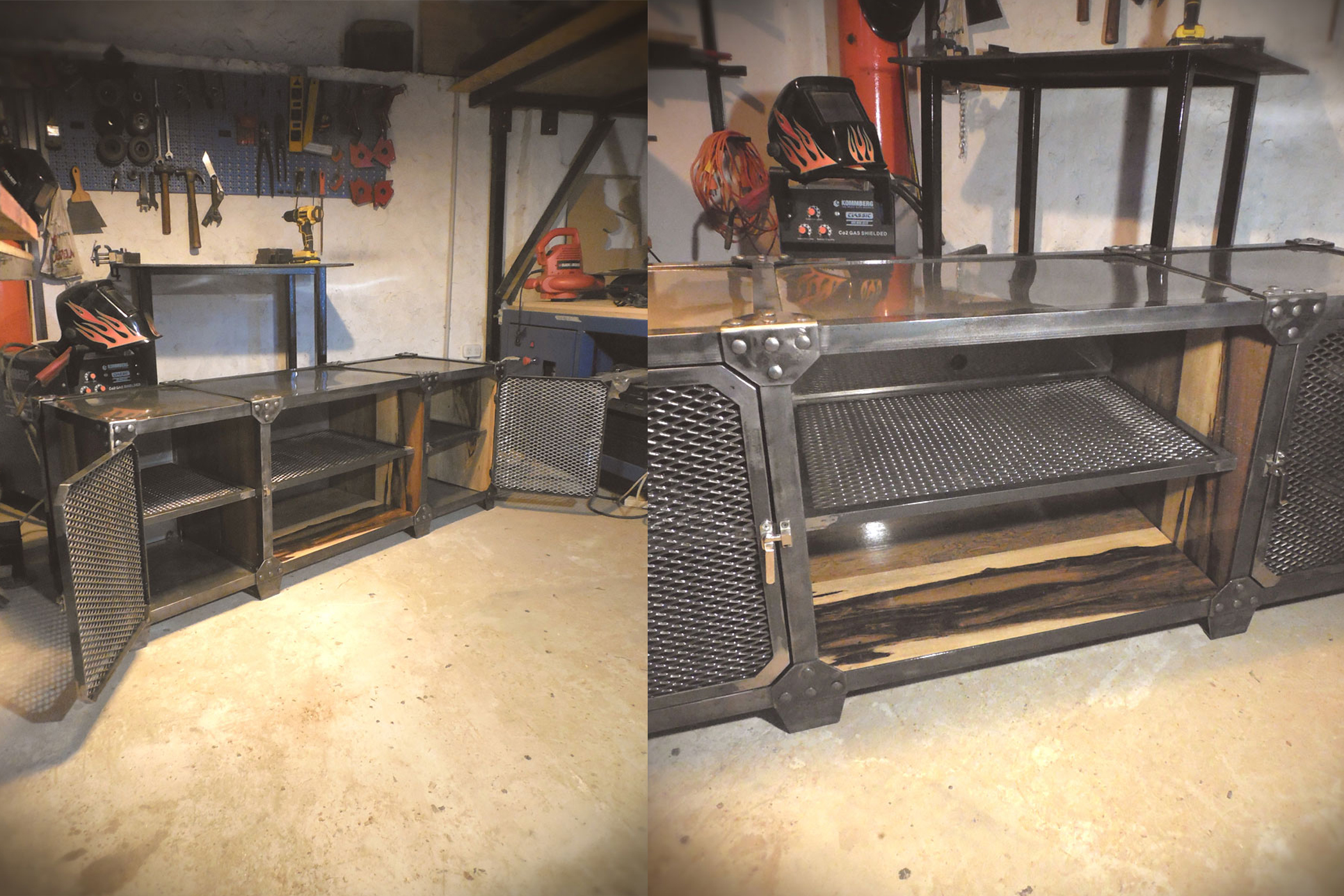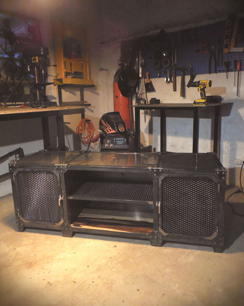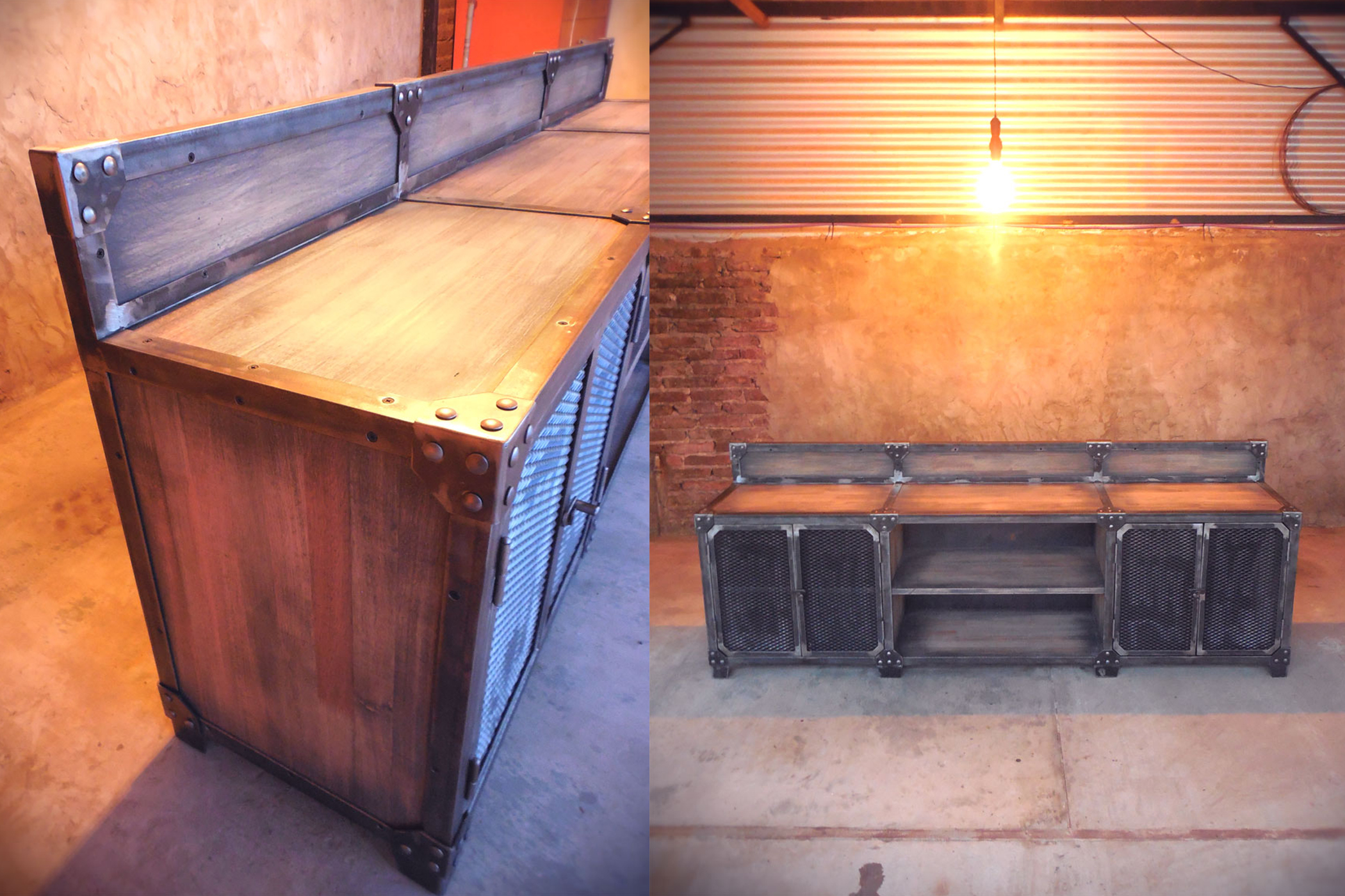 Modular TV en hierro crudo con barniz mate y madera maciza patinada terminada en laca mate.