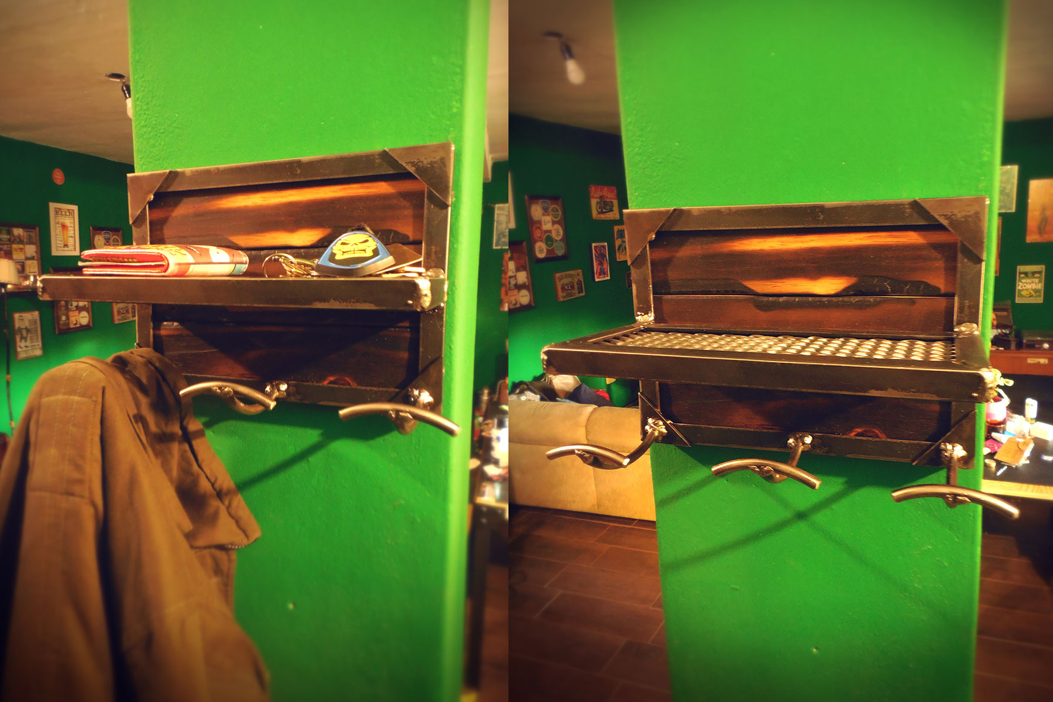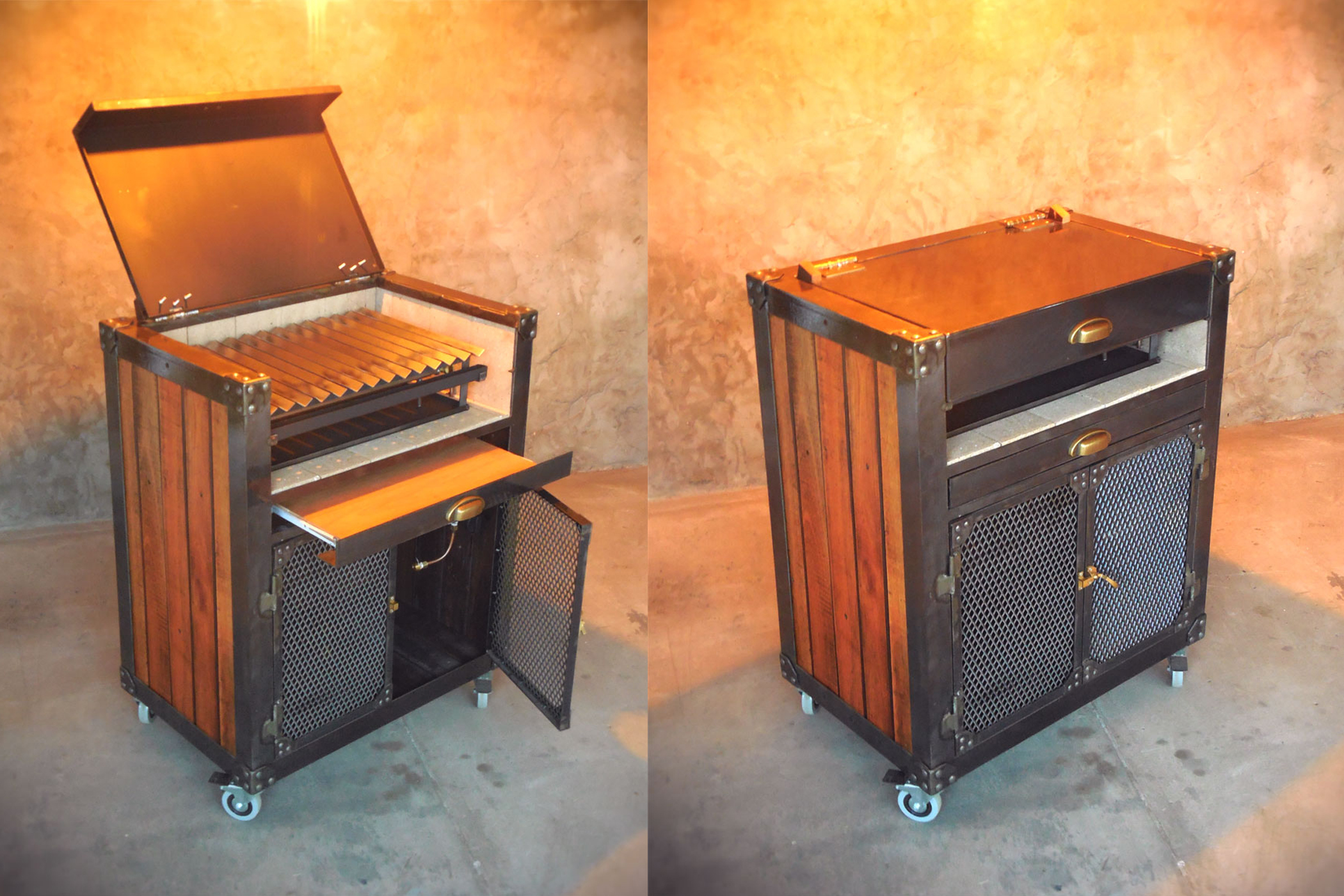 Parrilla diseñada para balcón, detalles en madera laqueada y metal desplegado.