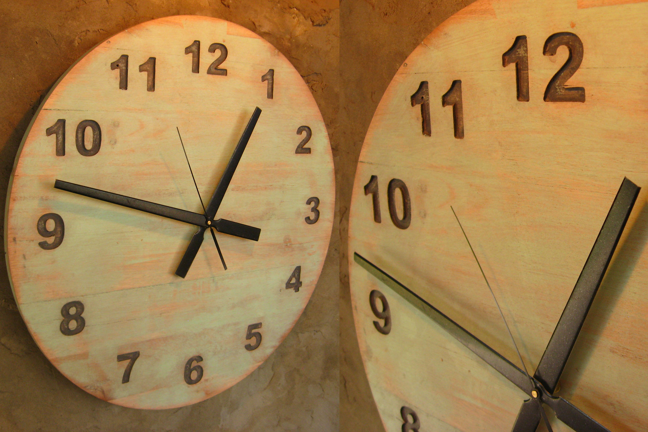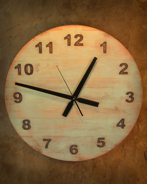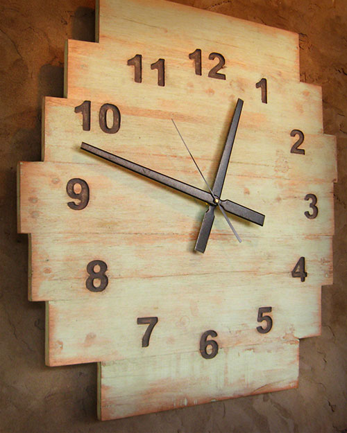 Reloj de pared en madera, pintado en verde claro con efecto de desgaste.
