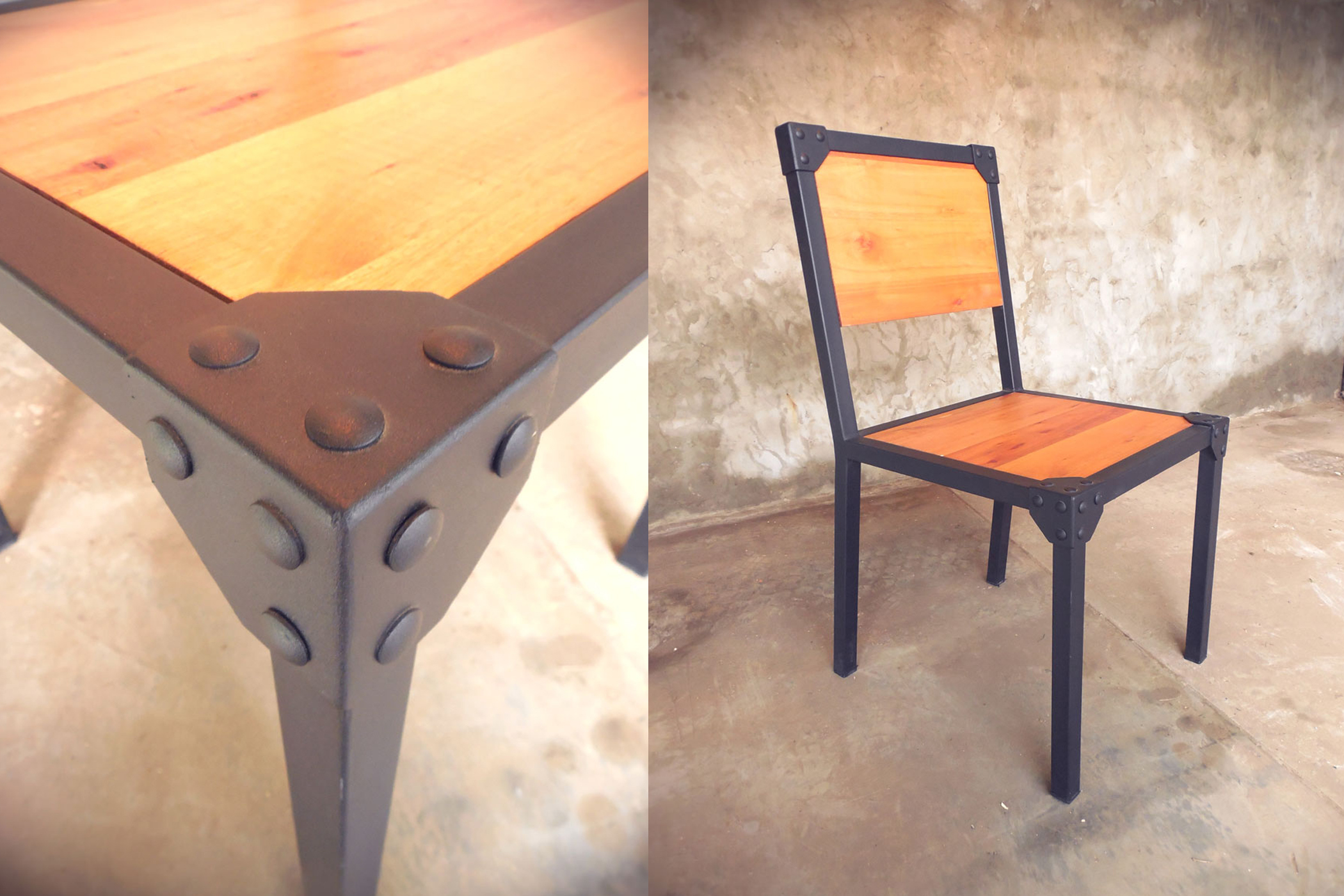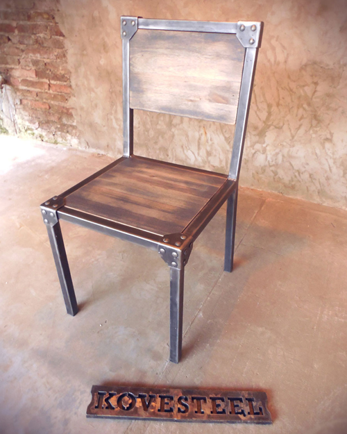 Silla industrial hierro oscuro mate madera maciza patinada con terminacion en laca mate.