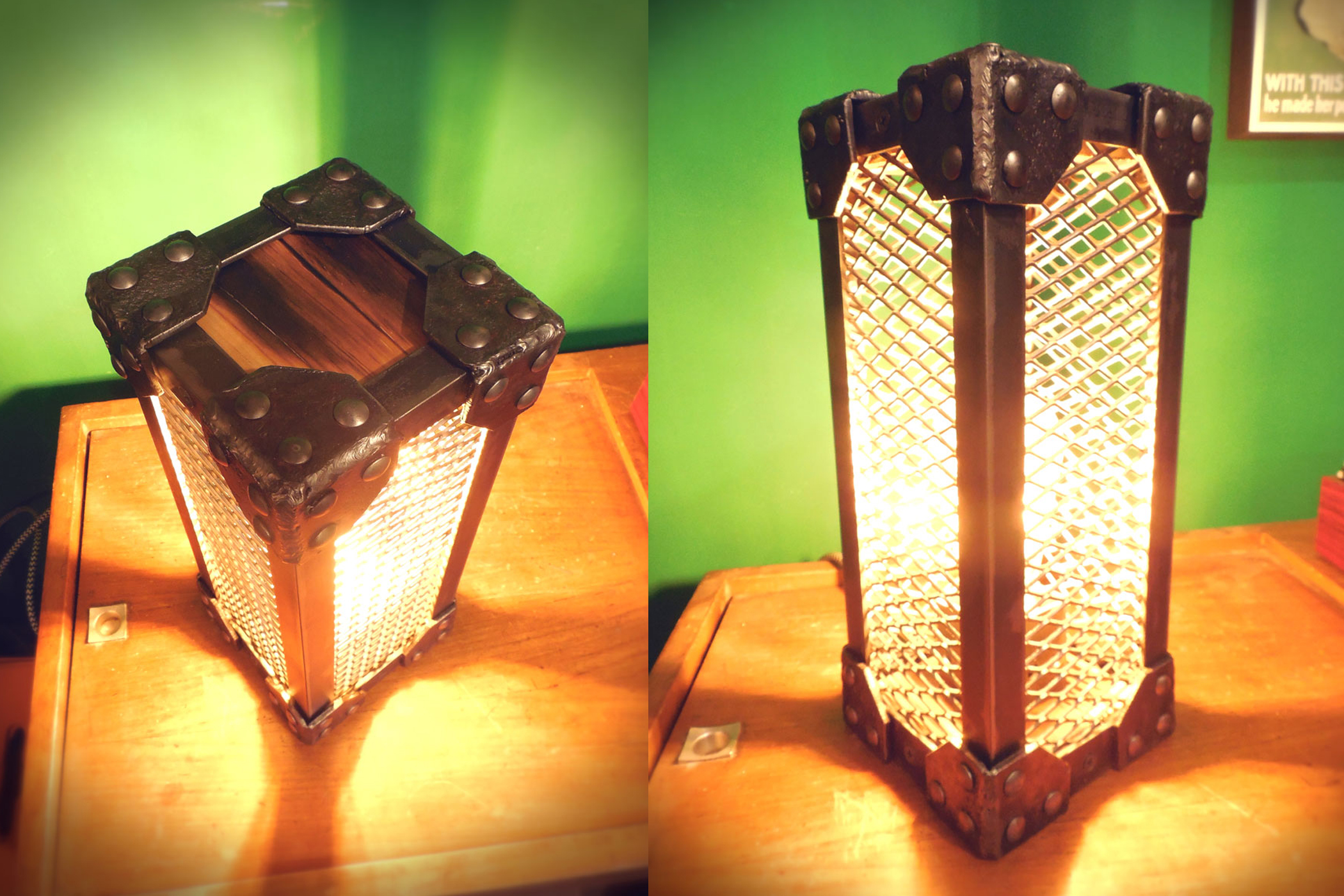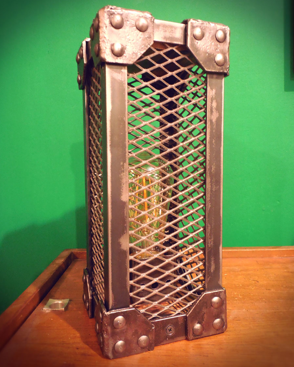 Velador de hierro terminado en crudo con barniz mate, madera terminada en laca mate.