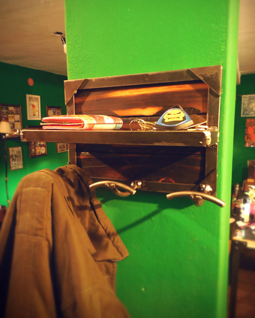 Perchero de hierro y madera. Terminacion barniz y laca mate.